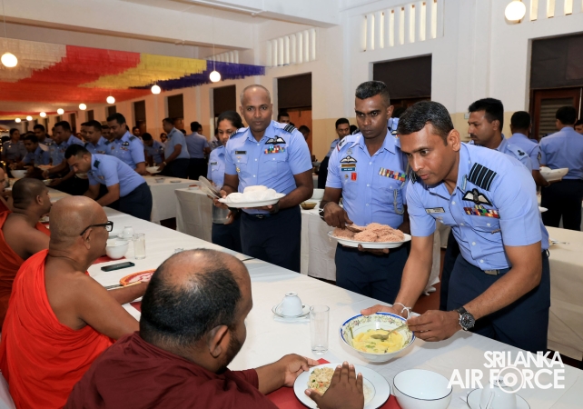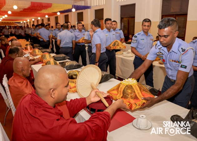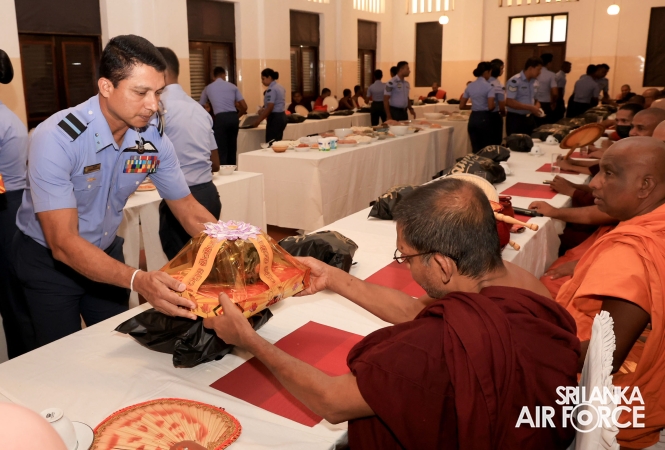 An almsgiving ceremony in honor of the venerable Maha Sangha was held today (20 September 2025), continuing the customary practice of merit-making. The event was attended by Commandant of SLAF Academy China Bay, Air Commodore Amal Perera, along with officers, other ranks and civilian staff of the Academy.