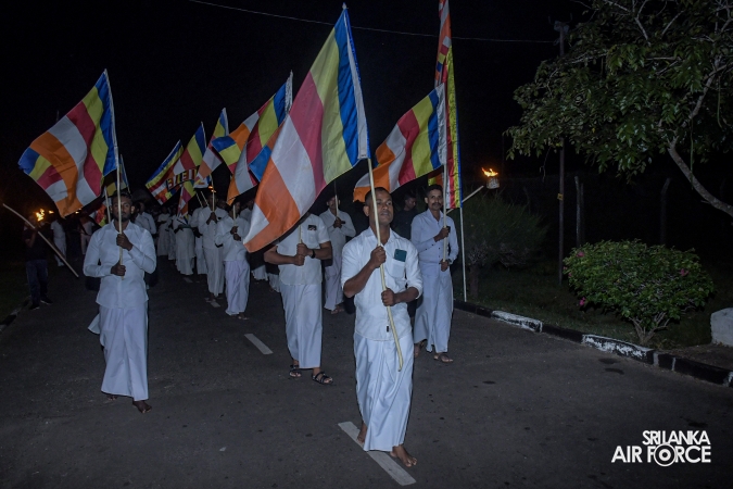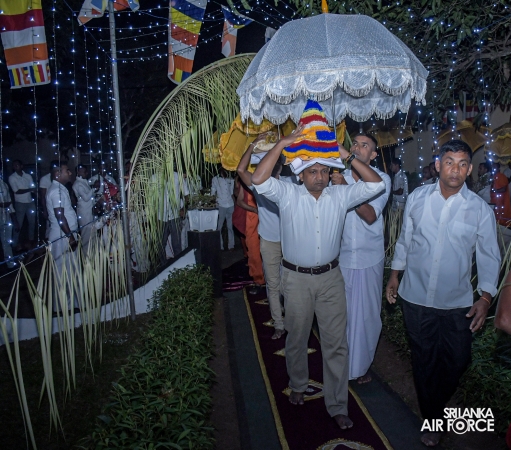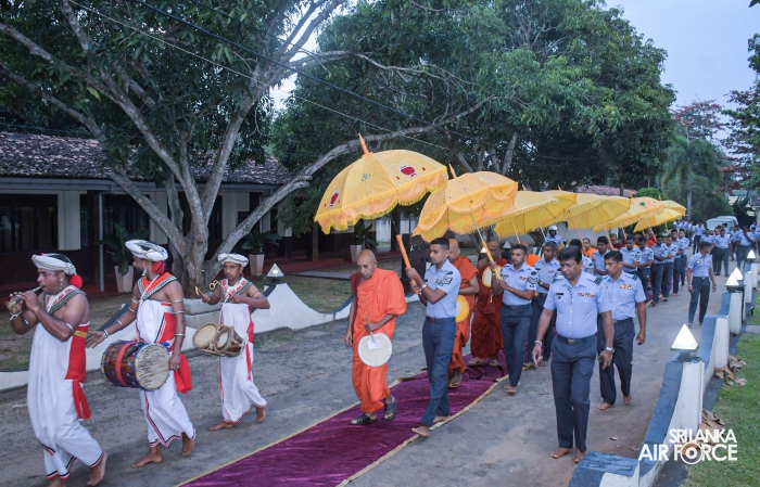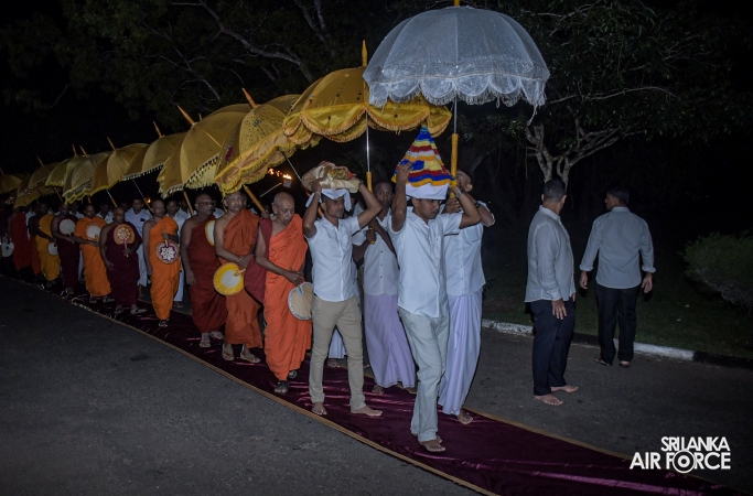 ආගමික වැඩසටහන විචිත්රවත් පෙරහැරකින් ආරම්භ විය. එම කාලය තුළ පූජනීය කරඩුව (ධාතු කරඬුව) චාරිත්රානුකූලව ගුවන් හමුදා කඳවුර වවුනියාව වෙත රැගෙන යන ලදී. ඉන්පසු පූජනීය ධාතූන් වහන්සේ අලංකාර ලෙස සරසා ඇති පිරිත් මණ්ඩපයේ කඳවුරු අණදෙන නිලධාරියා විසින් ගෞරවාන්විතව තැන්පත් කරන ලදී. කඳවුරු පරිශ්රය තුළ සන්සුන් භාවය, පරාවර්තනය සහ අධ්යාත්මික සුවය ඇති කිරීමේ වාතාවරණයක් නිර්මාණය කරමින් රාත්රිය පුරා පිරිත් සජ්ජායනය සිදු කරන ලදී.