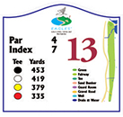 | This is an outstanding golf hole which many will say is the Signature Hole-but as the golfer will see, there are other contenders for this title. The drive from an elevated tee calls for both accuracy and strategy. The more daring player can opt for placing his tee shot well to the right skirting Snug Cove. From there a mid-iron played over the water will set up par. For the more circumspect, the safer route takes in the left side of the fairway, but this route must avoid a stately Kumbuk tree, and getting on the green in regulation may not be possible. | ||||||