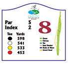 | A great Par 5 played from an elevated tee to an undulating fairway. The fairway drifts away to the left and rises slightly towards the green. The green will only be reached in regulation with three long and accurate strokes. The fairway and green are lined by magnificent trees. | ||||||