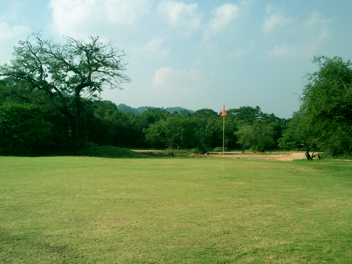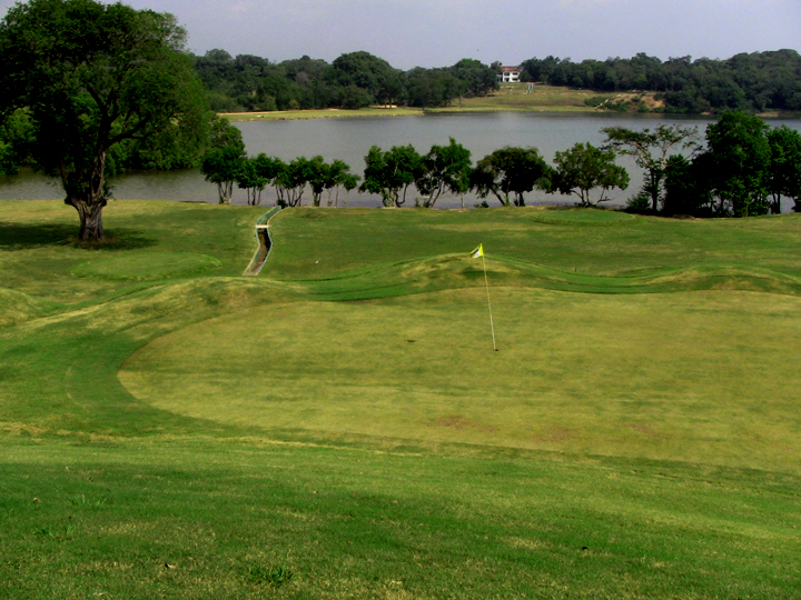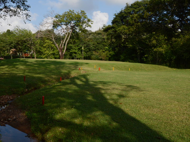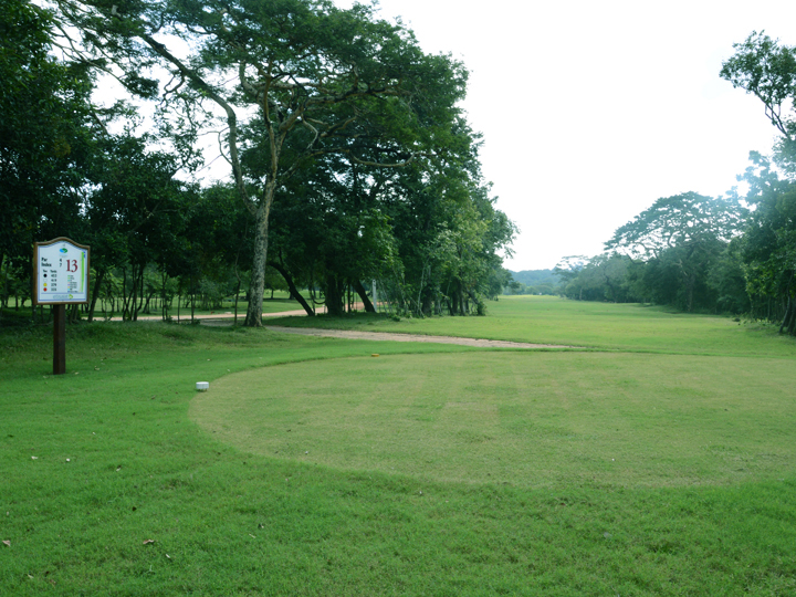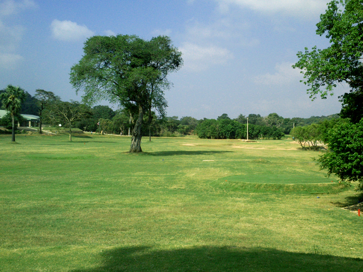 | The tee shot may be placed to the right or left of the stately Ficus tree dominating the fairway. Both approaches offer opportunities for a mid-iron to the green. Relief can be obtained from the road which borders the right side of the fairway. The ground falls away sharply to the right beyond the road. | ||||||