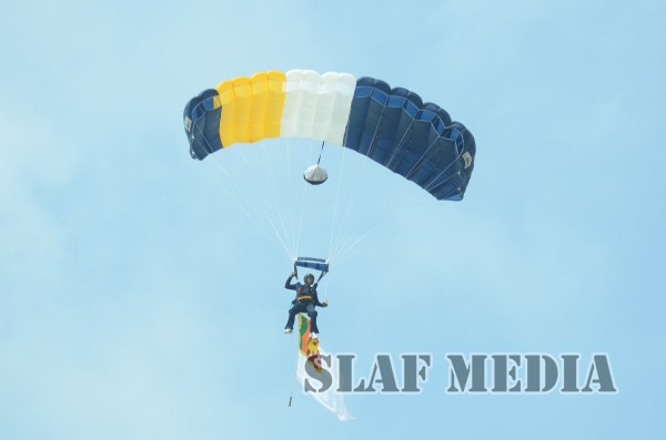 Sky Divers from the three services which included two SLAF female freefallers, guided by jump master Sqaudron Leader Sampath Piyasundara madefree fall jumps at five thousand feet from an SLAF MI 17 to conclude the parade in a colourful manner.