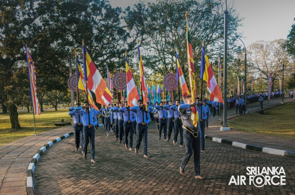 As flag-bearers lined up at the Welimaluwa (lower-layer), a colourful pageant led by monks proceeded to the Udamaluwa for religious performances, after which all flags representing the Sri Lanka Air Force and all Air Force Establishments were taken to the upper layer for the symbolic invocation of blessings. This symbolized the blessing of all personnel of the Sri Lanka Air Force serving around the entire island in various capacities.