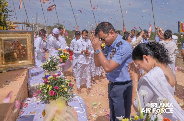 During the ceremony, the Secretary of Defence deposited the relics in the Neelagiri Maha Seya, amidst the chanting of 'Seth Pirith' by the Maha Sangha. Subsequently, a Bell-212 helicopter from the SLAF showered flowers from the air as floral tributes were offered.
