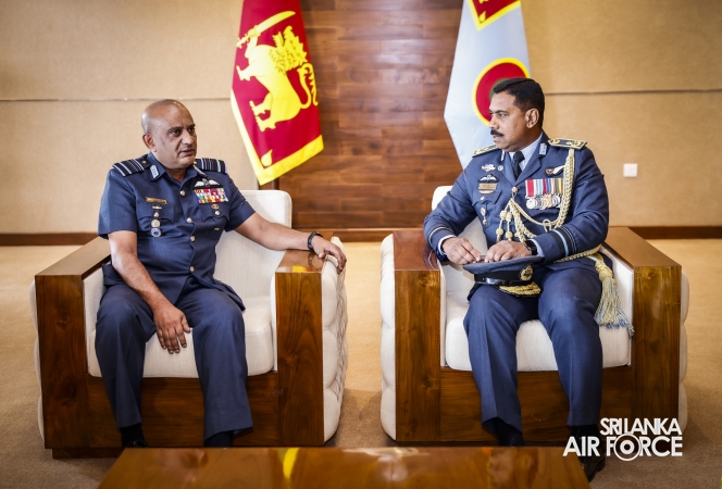 Air Vice Marshal Wickremaratne made an official farewell call on the Commander of the Air Force, Air Marshal Bandu Edirisinghe, at his office yesterday (01 April 2025). The Commander commended him for his dedicated service rendered to the nation and to the Sri Lanka Air Force in particular. The Commander also emphasized that he was one of the key stakeholders during times of need for our motherland and that his heroic history will remain etched in the annals of the SLAF. The Commander and Air Vice Marshal Wickremaratne exchanged mementos to mark the occasion.