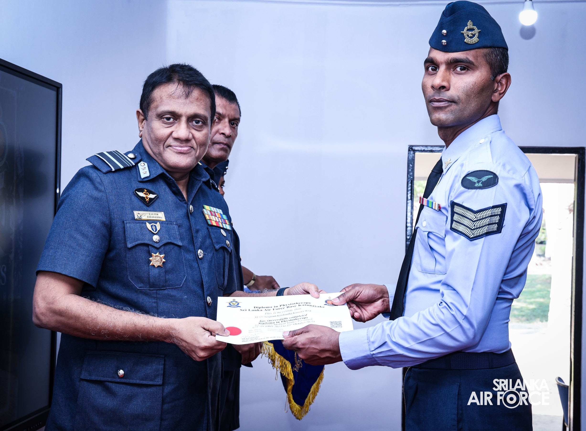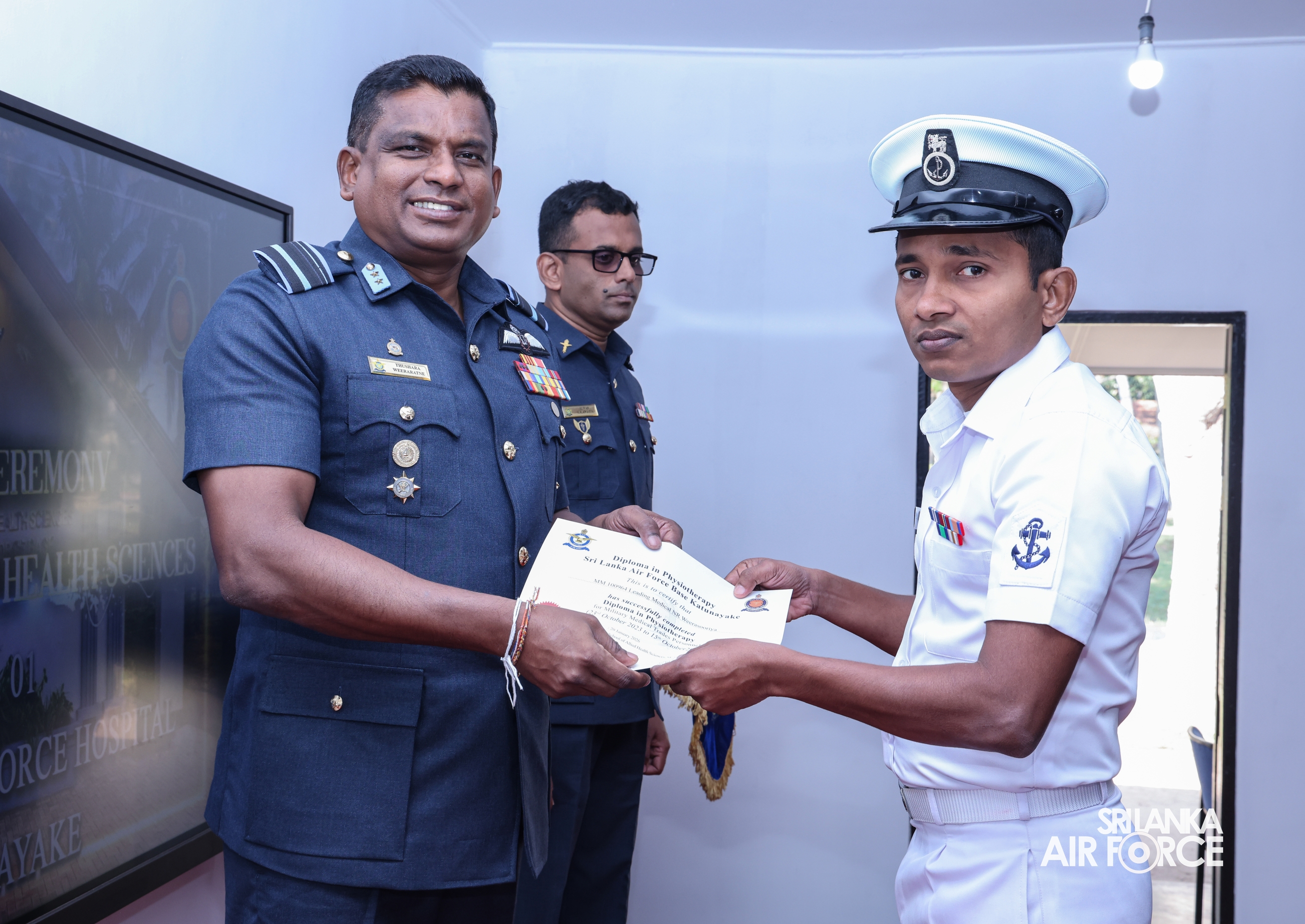 Certificates were awarded to 13 trainees comprising three Sri Lanka Army, six Sri Lanka Navy and four Sri Lanka Air Force personnel. The course was conducted for a period of two years from 10 October 23 to 15 October 25. Under the guidance of the Commanding Officer Hospital Group Captain Sampath Hewawasam, the course was conducted by Squadron Leader Chameera Neththikumara following a national curriculum on physiotherapy.