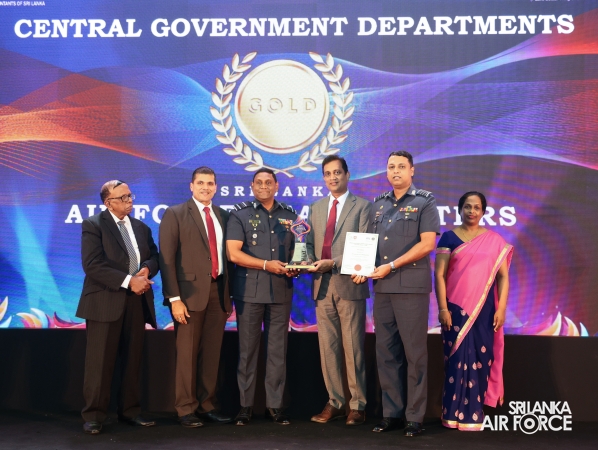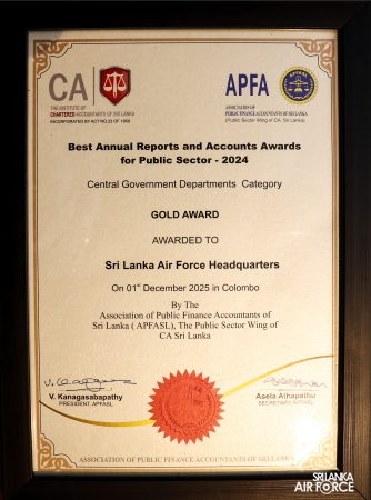 The SLAF secured the Gold Award for the third consecutive time in the Central Government Department Category reflecting its effective utilization of airpower in ensuring national security. The event was graced by Mr. Nishantha Jayaweera, Honorable Deputy Minister of Economic Development. Representing the SLAF, Director General Administration, Air Vice Marshal Thushara Sirimanne, Director Internal Audit (Service) Group Captain Ranjith Somathilake and Flight Lieutenant HMSEB Herath received the award. Subsequently the award was formally presented to the Commander of the Air Force, Air Marshal Bandu Edirisinghe today (06 February 2026) at the Commander’s Office by Director General Administration, Air Vice Marshal Thushara Sirimanne, Director Internal Audit (Service) Group Captain Ranjith Somathilake along with other Officers and other ranks who contributed to the report.