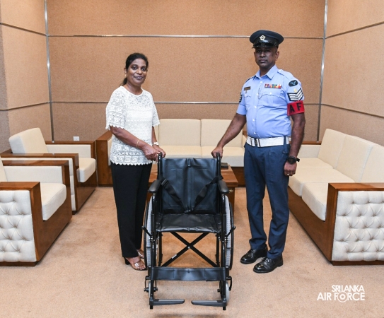 The Chairperson of the SLAF Seva Vanitha Unit, Mrs. Krishanthi Edirisinghe handed over Two (02) Wheel Chairs to deserving family members of service personnel today (27 January 2026) at Air Force Headquarters in Sri Jayewardenepura.
